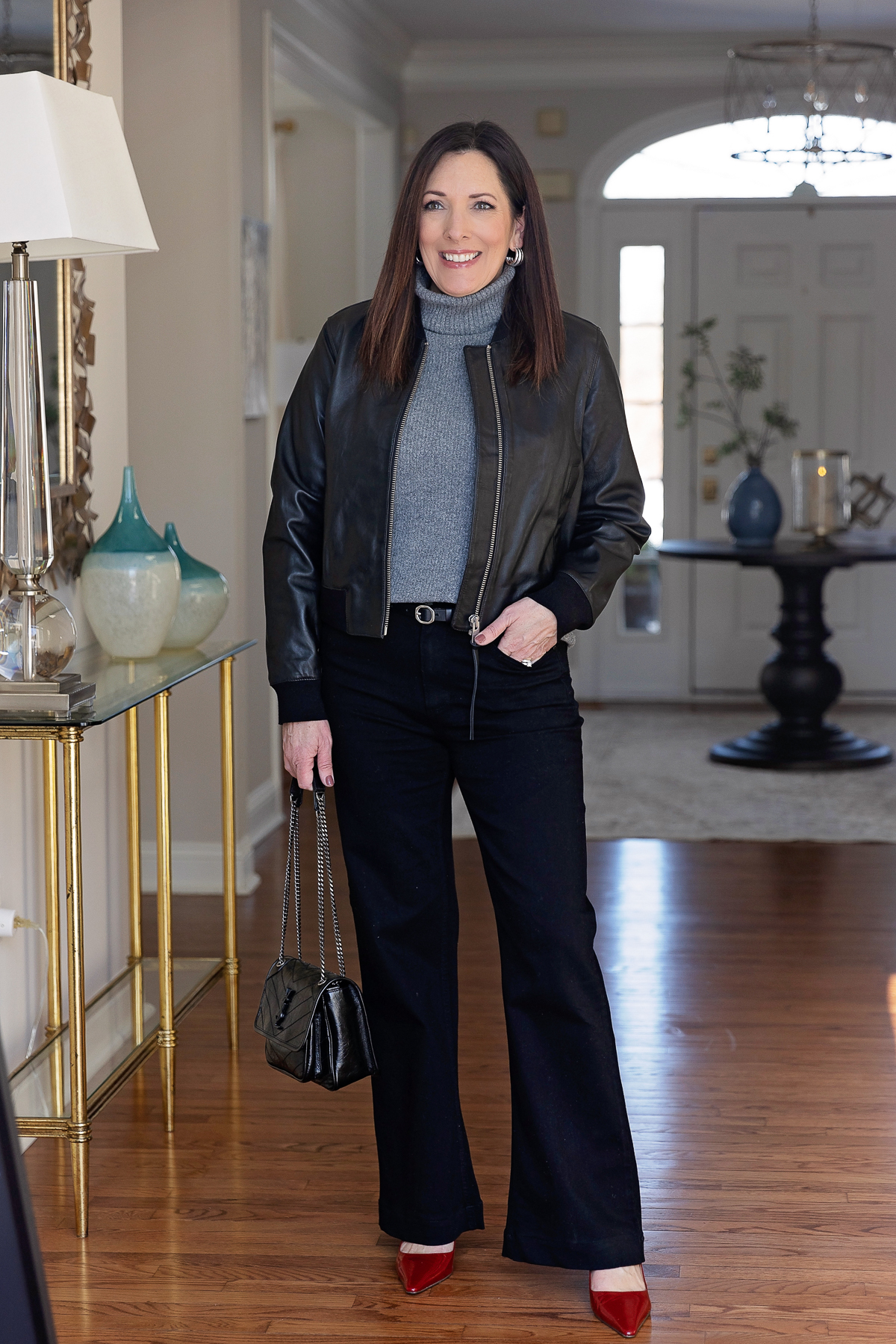 AllSaints Orten Leather-based Bomber (8) // Caslon Rib Turtleneck (S) // PAIGE Leenah Trouser Denims (29) // Sam Edelman Bianka Slingbacks (8.5) // rag & bone belt (M) // comparable bag // chunky hoops