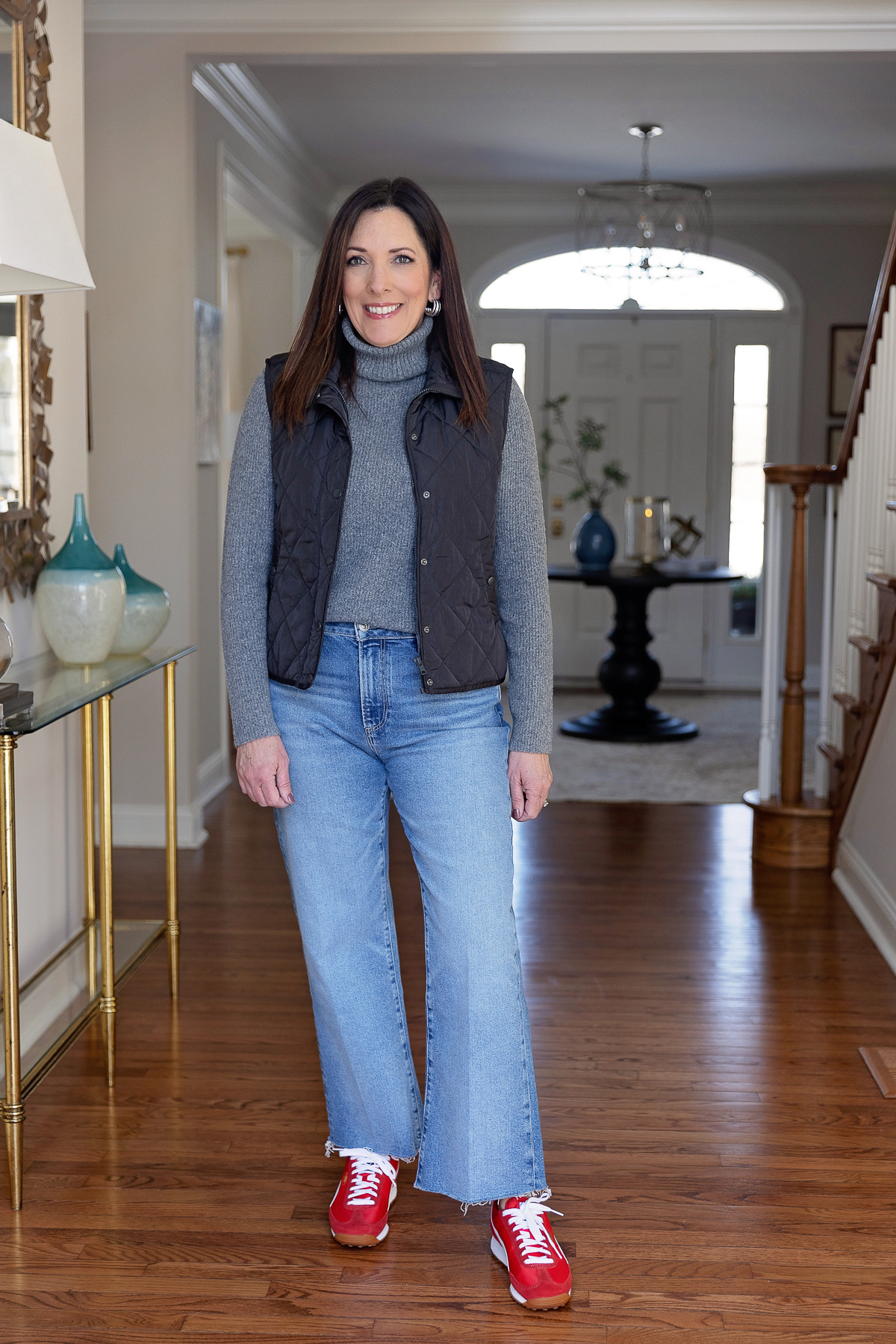 I really don’t have a brief puffer jacket proper now, imagine it or not! And the one informal jacket I’ve in a shade is my crimson Helly Hanson insulated rain coat, which is bought out, so I made a decision to put on the colour in my sneakers, and I simply wore a black quilted vest over the turtleneck sweater. I really nonetheless have the Tools turtleneck I’m carrying above, however I made a decision to shoot this look with a extra accessible choice—this Caslon ribbed turtleneck in the dead of night gray heather. (It’s low stock, however the medium gray heather is absolutely stocked.)