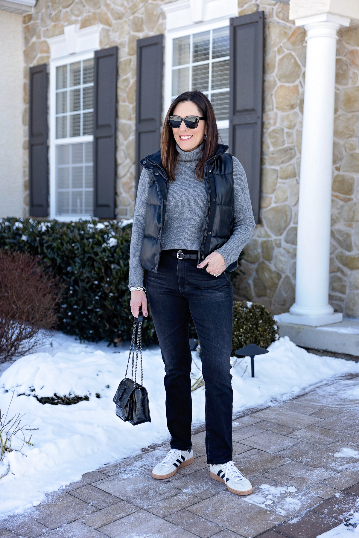 THEN (2022): gray turtleneck sweater // washed black slim straight leg denims // VEJA sneakers // black puffer vest