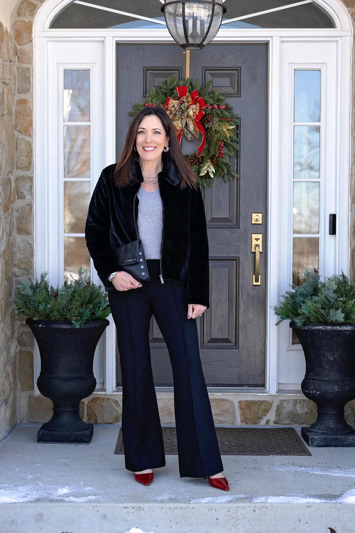 I additionally did an identical look to the 2022 look with black pants, however this time as a substitute of the Vince Crop Leggings, I wore the SPANX Good Match Ponte Flare Pants. And in step with the unique outfit, I went with a daring crimson kitten heel slingback—though the pop of crimson with an all black outfit isn’t actually a present look. The shoe itself is present, however I’d in all probability go for my black croc-embossed Vince kitten heel slingbacks with this outfit as a substitute. The croc embossed texture provides a pleasant element to the look with out drawing all the eye to the toes, and it retains the look monochromatic.