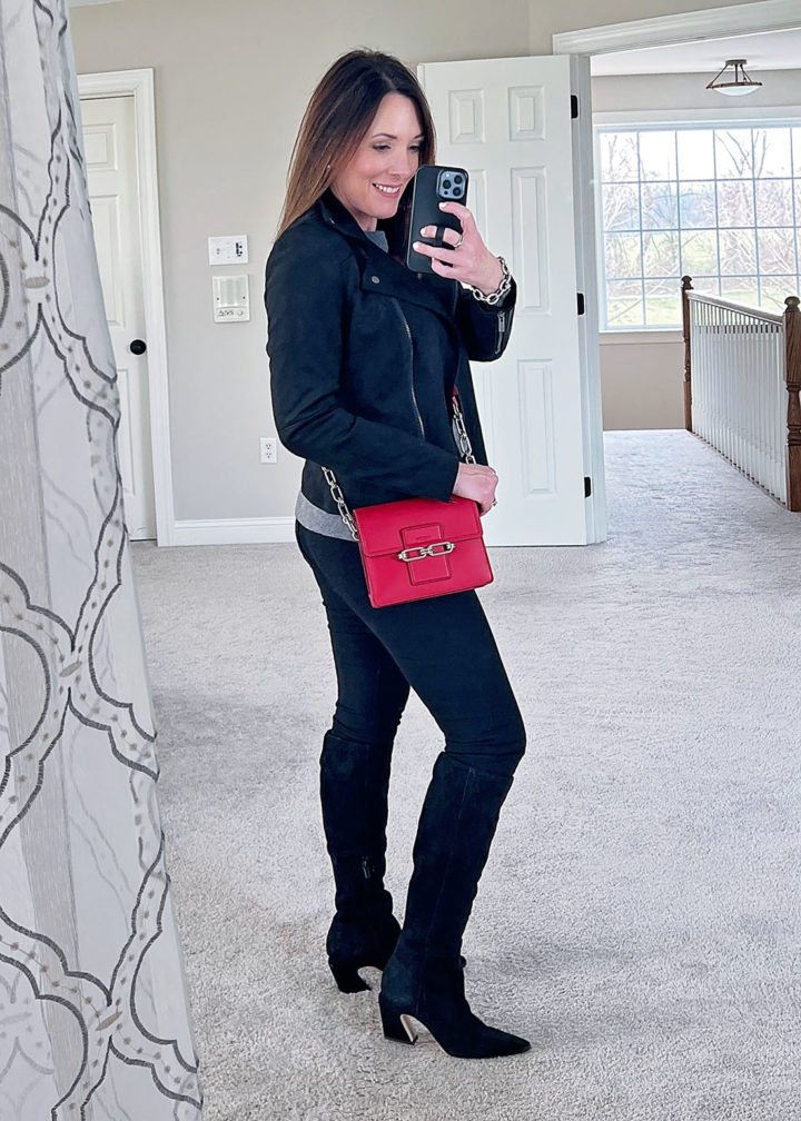Right here we’re once more with the pop of crimson… haha! I ended that sequence again in January 2020 with this monochromatic winter date night time outfit. I paired suede over the knee boots with black skinny denims, and I wore a basic cashmere crewneck with my leather-based moto on high. Then I added a crimson crossbody with silver chain element for a bit of pizazz. I really actually just like the crimson bag on this look, fairly than within the footwear… and I certain do want I’d saved that bag.