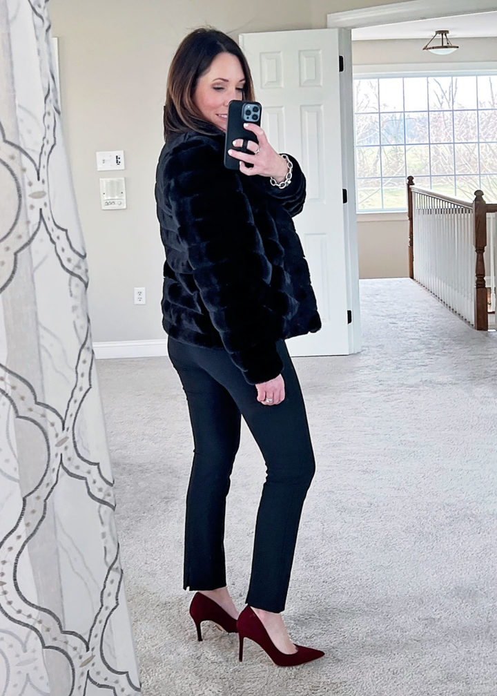 In 2022, I recreated that outfit with my Vince Crop Leggings for extra of an upscale feel and appear. I additionally went with a v-neck sweater as a substitute of a turtleneck, and a shorter black fake fur jacket as a substitute of the lengthy leopard print coat. I modified up the jewellery fairly a bit right here, as properly—I went for a crystal teardrop earring with an understated bezel station necklace. And I nonetheless added a burgundy suede pump, however this outfit appears a bit of extra basic to my eye.