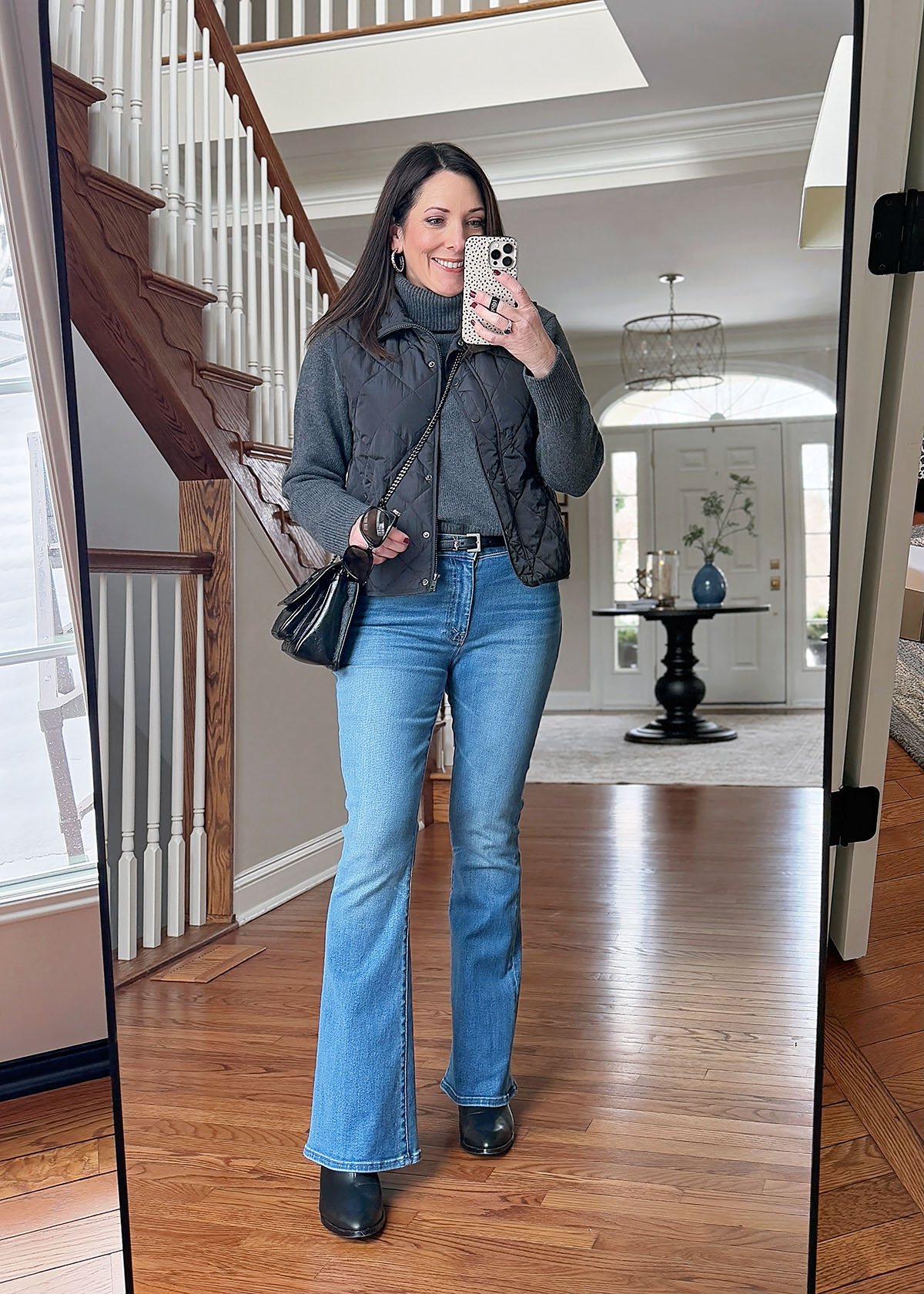 RIGHT: Halogen Funnel Neck Sweater (S) // Rowan Puffer Vest (S) // PAIGE Laurel Canyon Flares (29) // comparable boots (8) // comparable belt