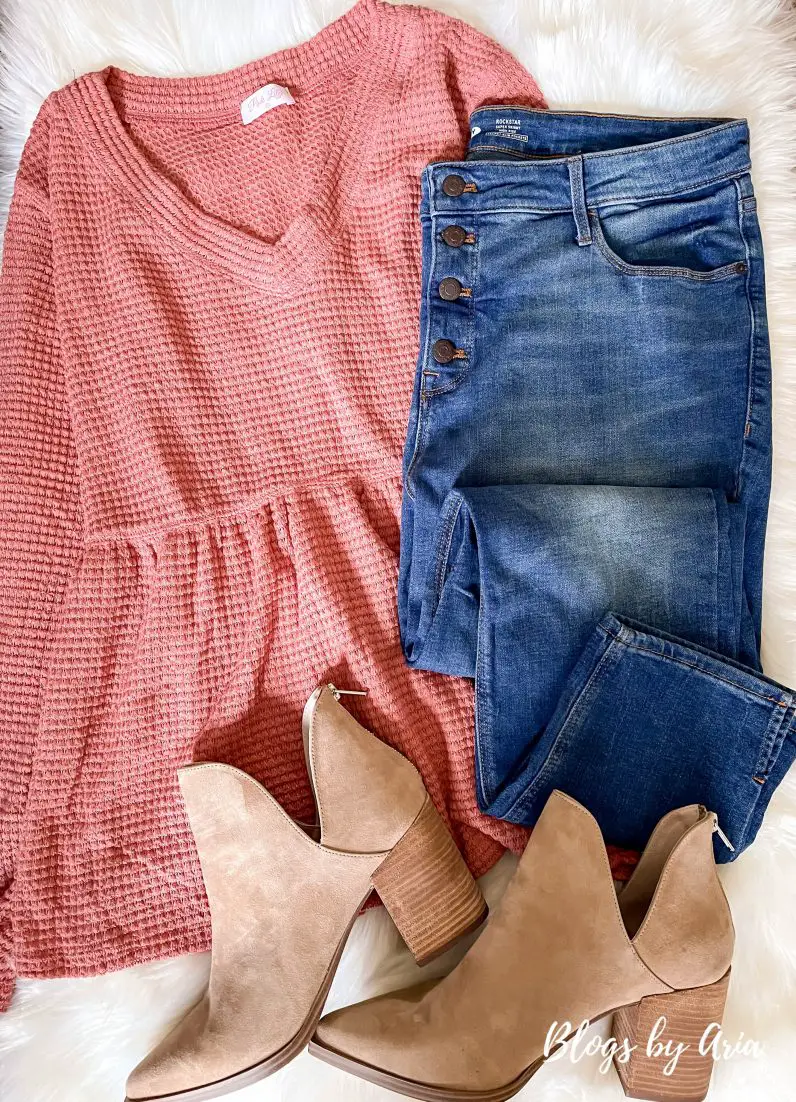 peplum waffle knit shirt | button fly denims | Cedar booties