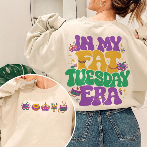 This sweatshirt screams Mardi Gras because of its graphics and textual content on the again that reads “in my Fats Tuesday Period.” That stated, it’s nonetheless cozy sufficient to put on any day of the 12 months.