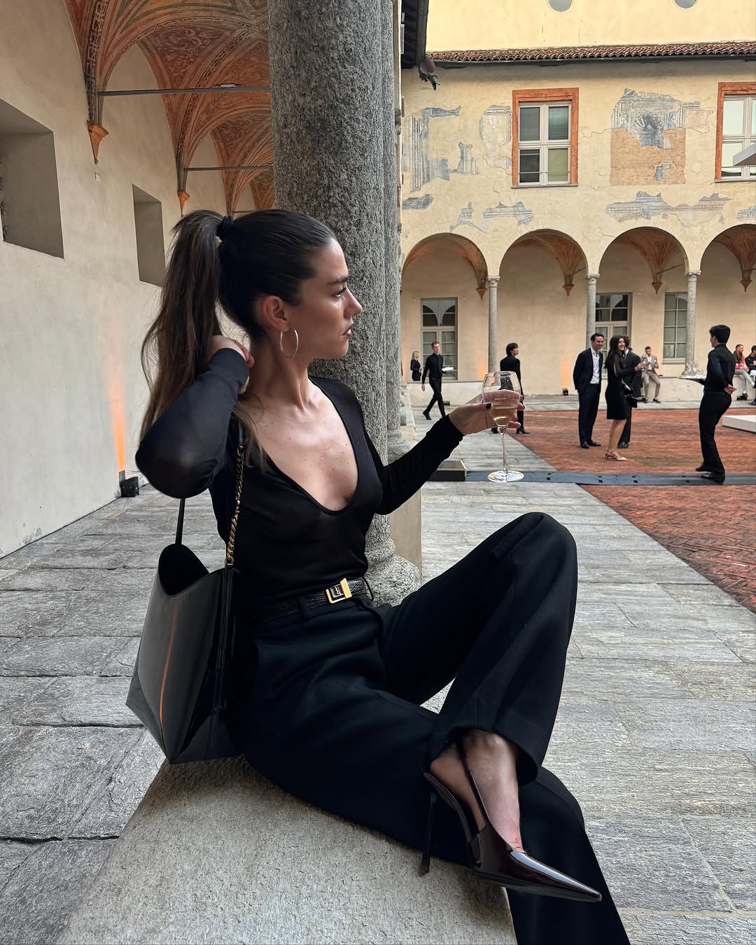 When doubtful, a smooth all-black look won’t ever fail for an evening out. Put on black trousers with a slinky bodysuit and punctuate it with a metal-closure belt and patent-finish slingbacks.