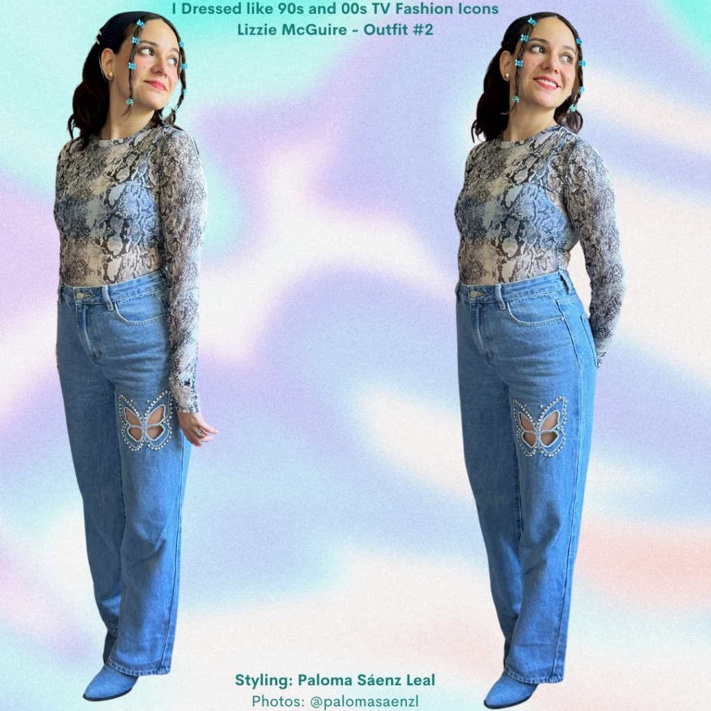 To create my Lizzie look, I needed mesh and bedazzled objects. I began with a snake print mesh prime in sky blue and paired it with blue denims with a bedazzled butterfly cut-out.
