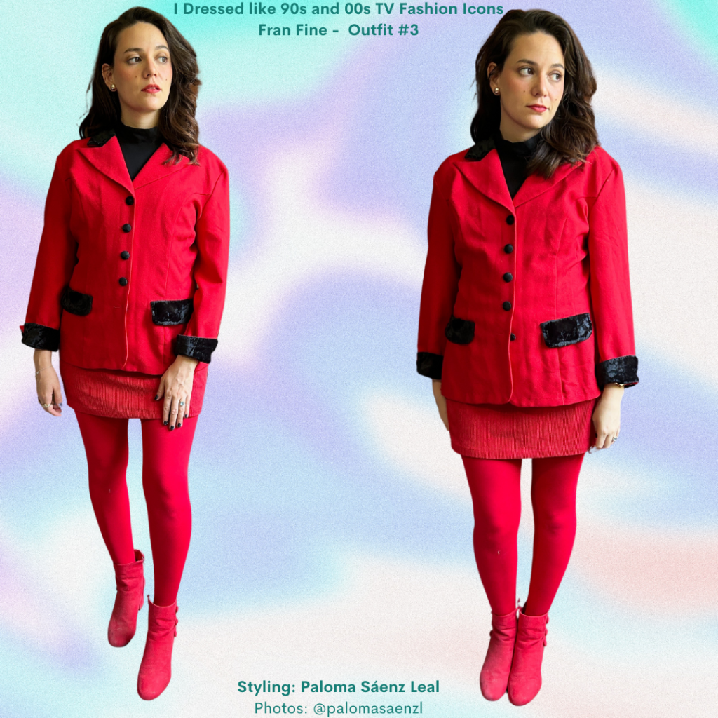 First, I wore a fitted, mock-neck black prime and a purple corduroy mini skirt. Following Fran’s steps, I threw on a purple blazer with black velvet particulars within the collar and cuffs.
