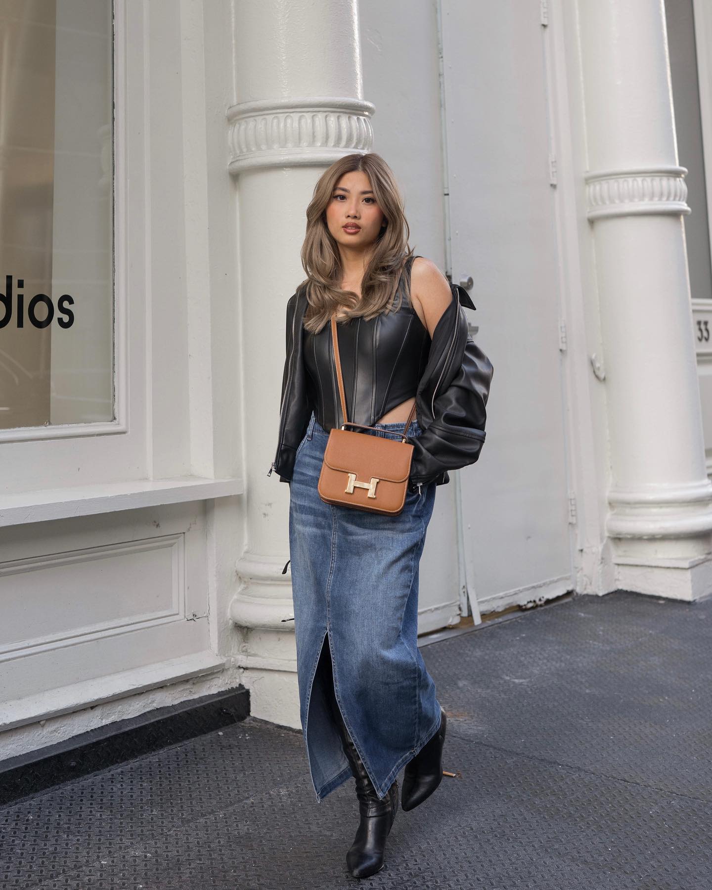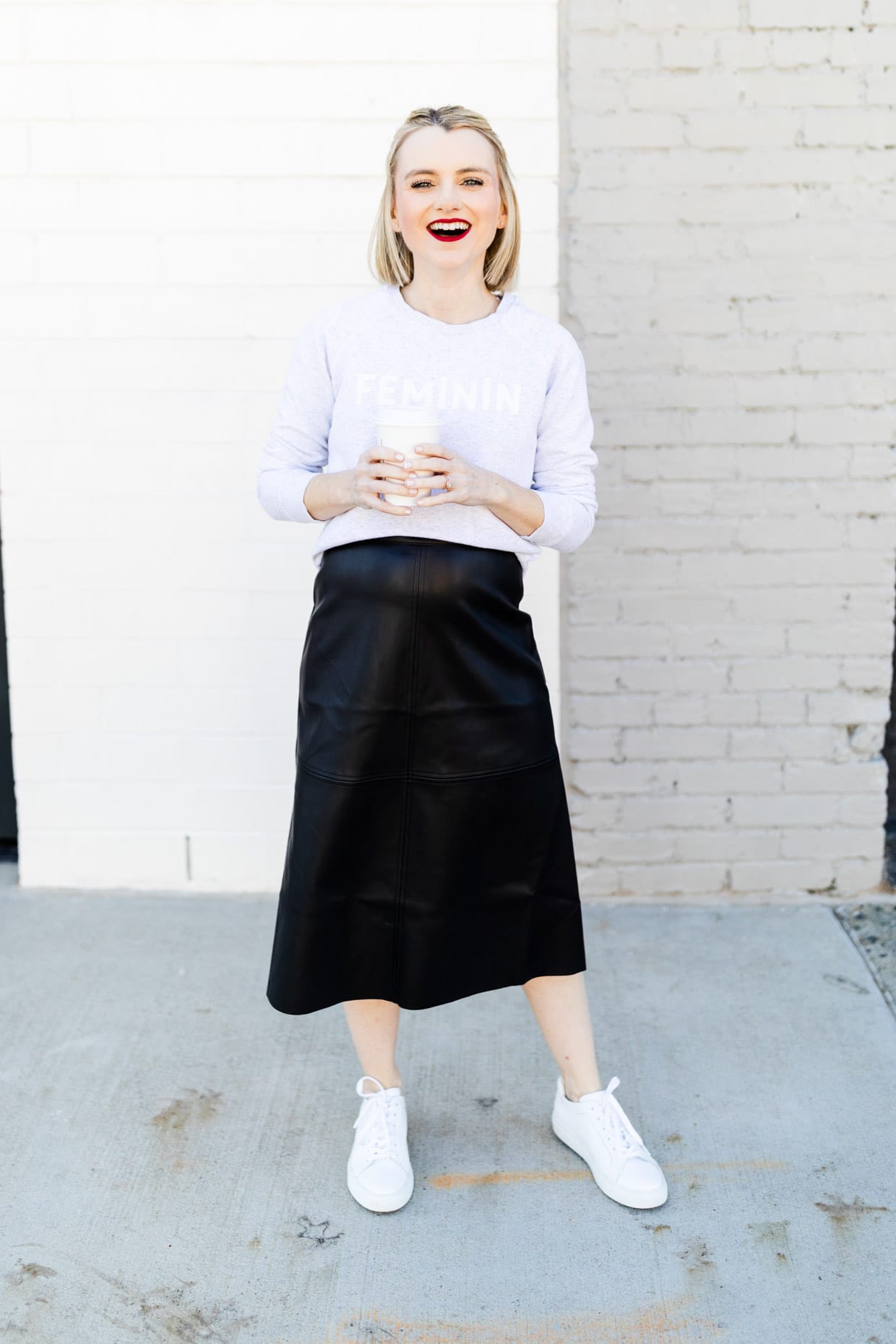 Stylist tip: Maxi skirts in a fake leather-based can at instances create heaviness on a petite body. When looking for this type, go for a maxi with a straight silhouette and a entrance or aspect slit for a streamlined look