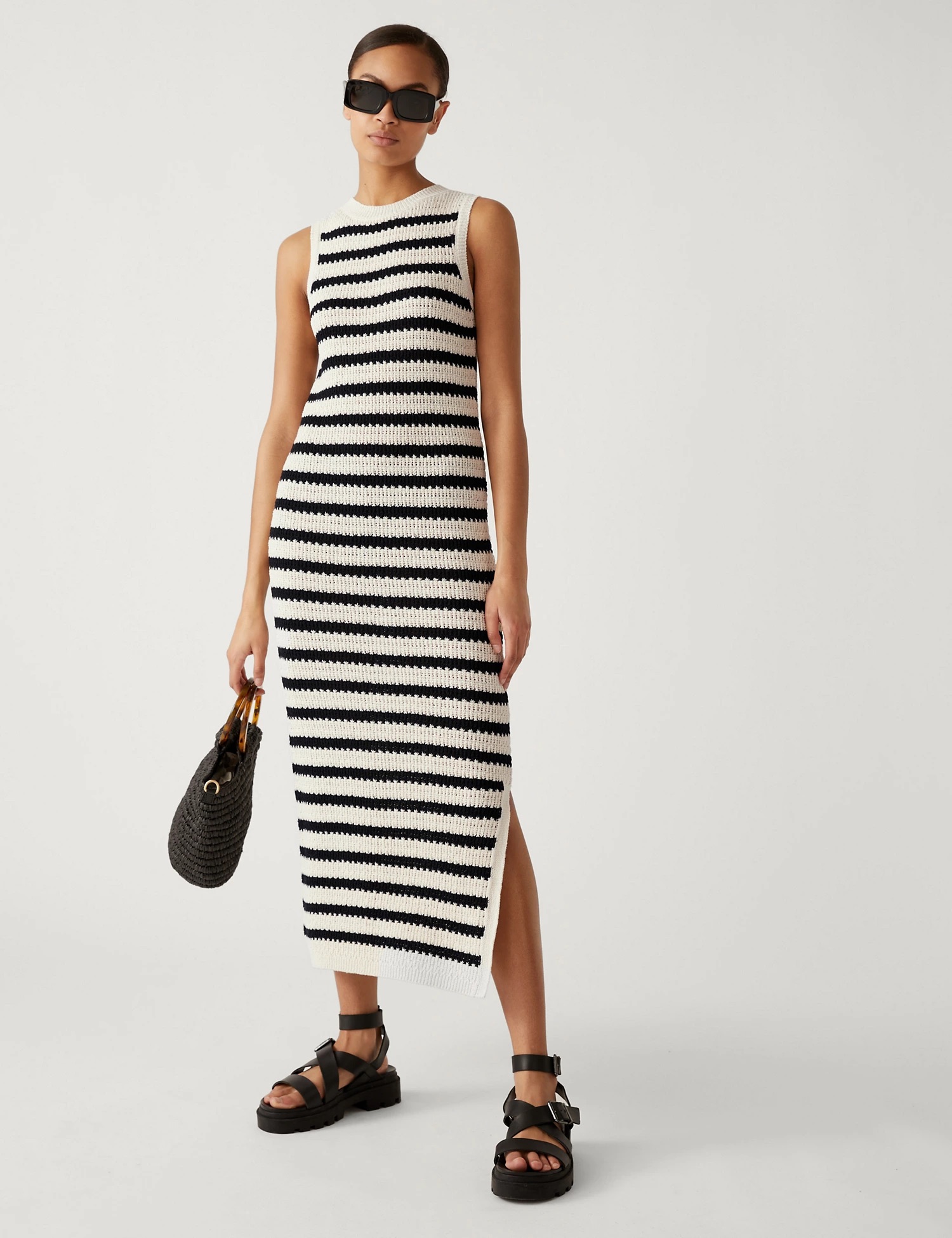 I am loving this striped midi. Add a linen blazer excessive and also you’re good to go.