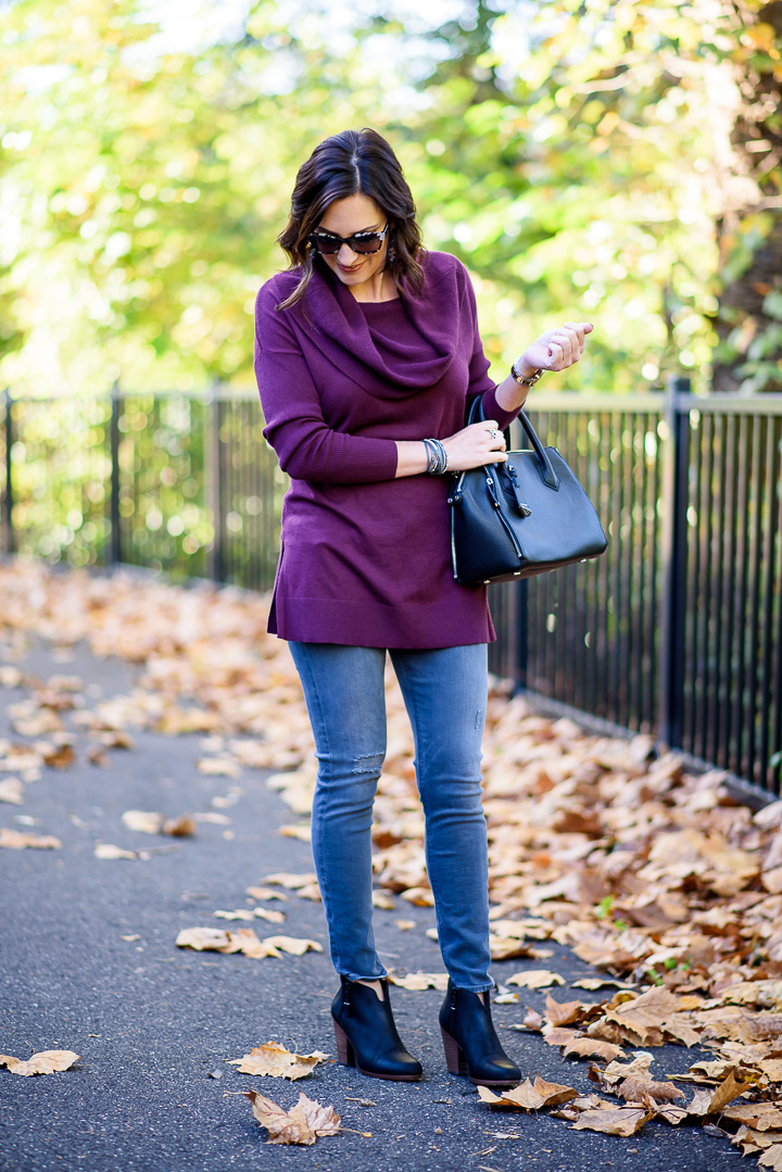 THEN (2017): cowl neck tunic (S) // gray skinny denims // rag & bone booties (39) // Rebecca Minkoff satchel // wrap bracelet // related sunnies