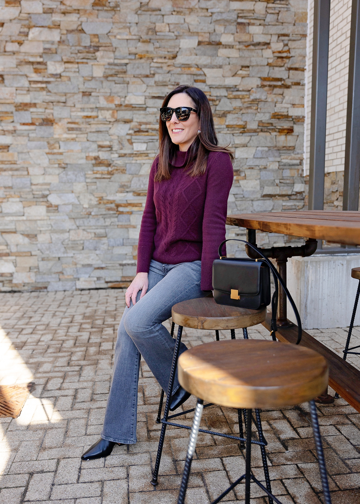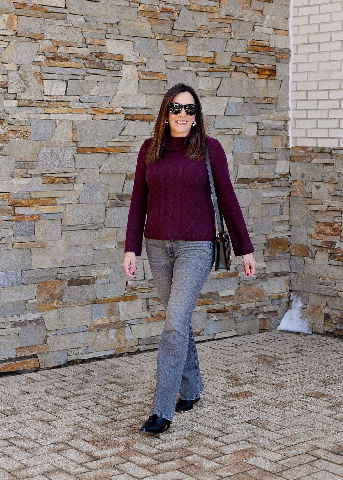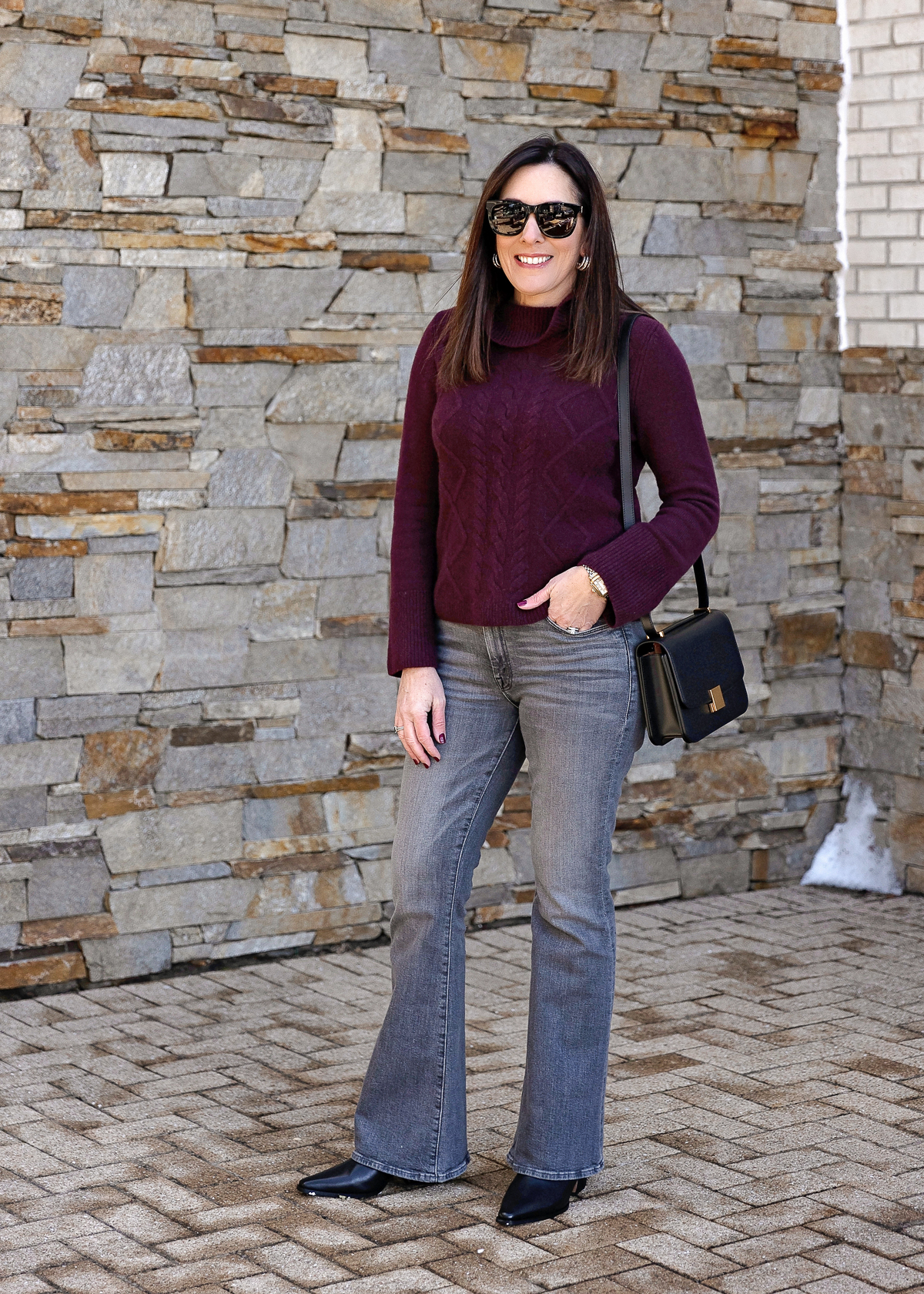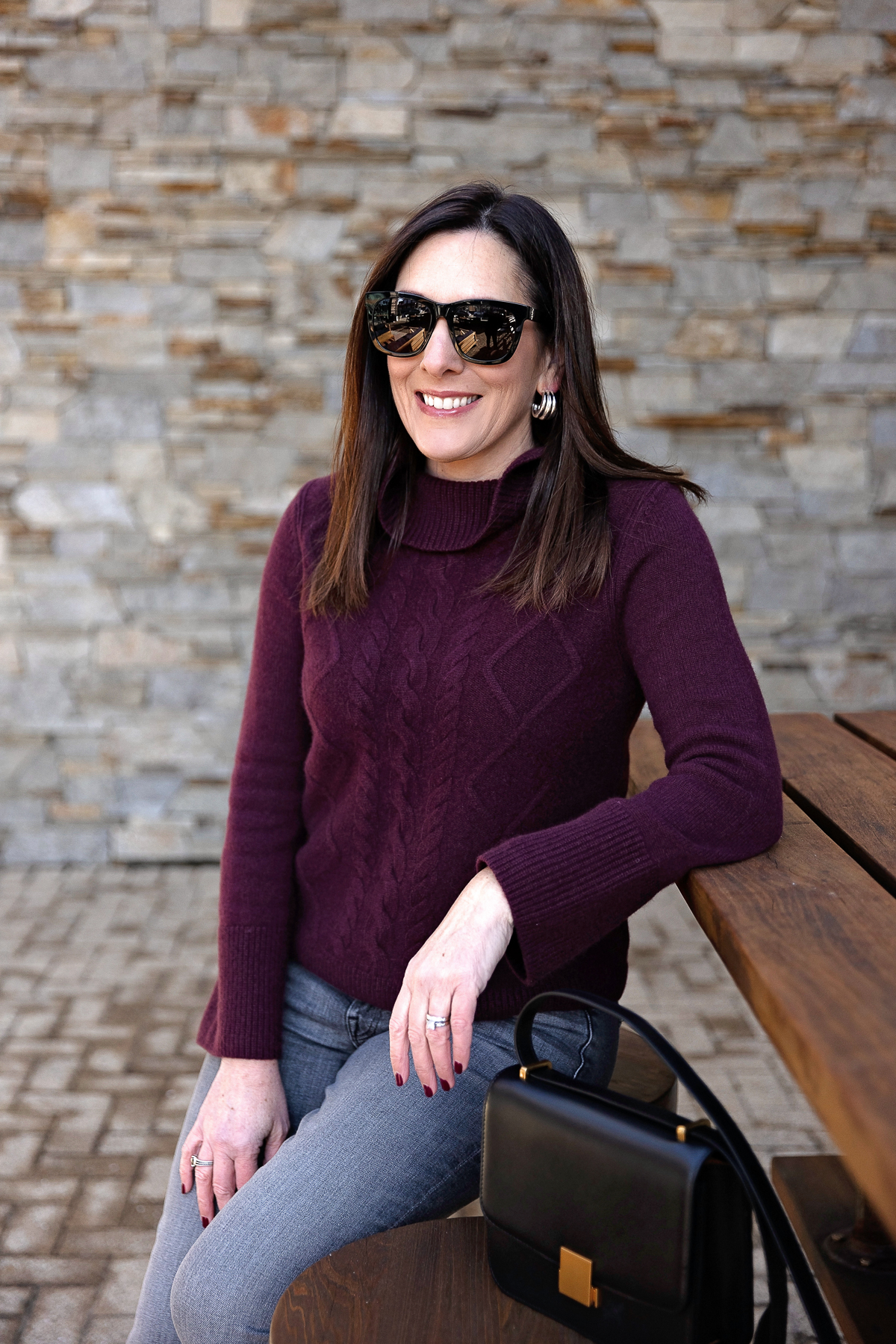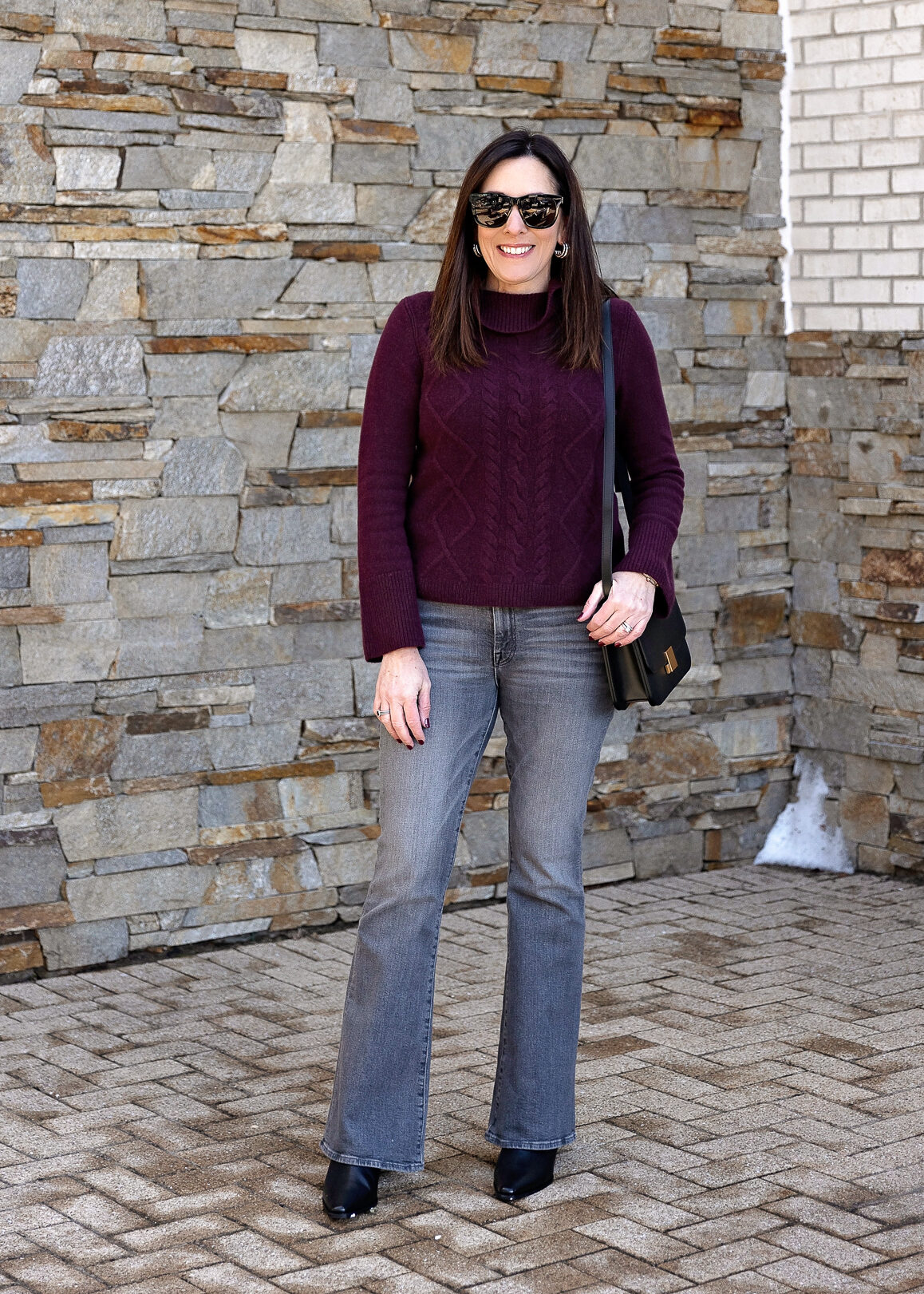 For this up to date look, I selected a burgundy cable knit sweater with on-trend flared sleeves and a extra refined cowl neck. I truly discovered this sweater at Talbots! In comparison with the thinner cloth of the unique tunic sweater, this cashmere knit is a particular improve—luxuriously mushy, plush, and made to final. I additionally love the gorgeous cable knit sample, and the flared sleeves with large ribbed cuffs add a contemporary twist. Plus, the 23″ size paired with full-length flare denims creates that pleasing 1/3 to 2/3 proportion.