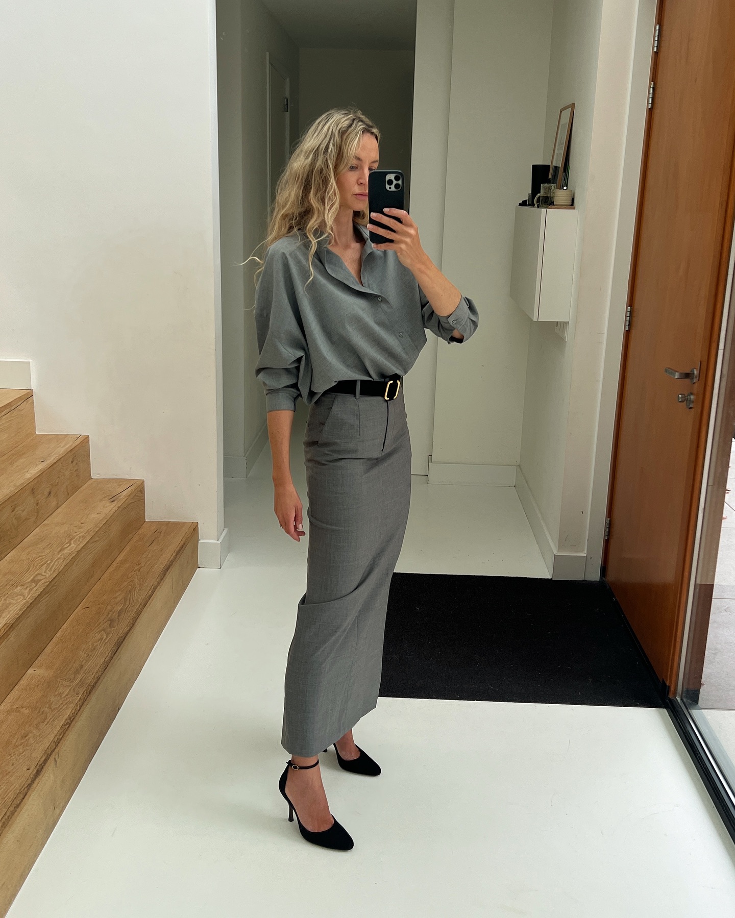 Column Skirt + Button-Down + Leather-based Belt + Pumps