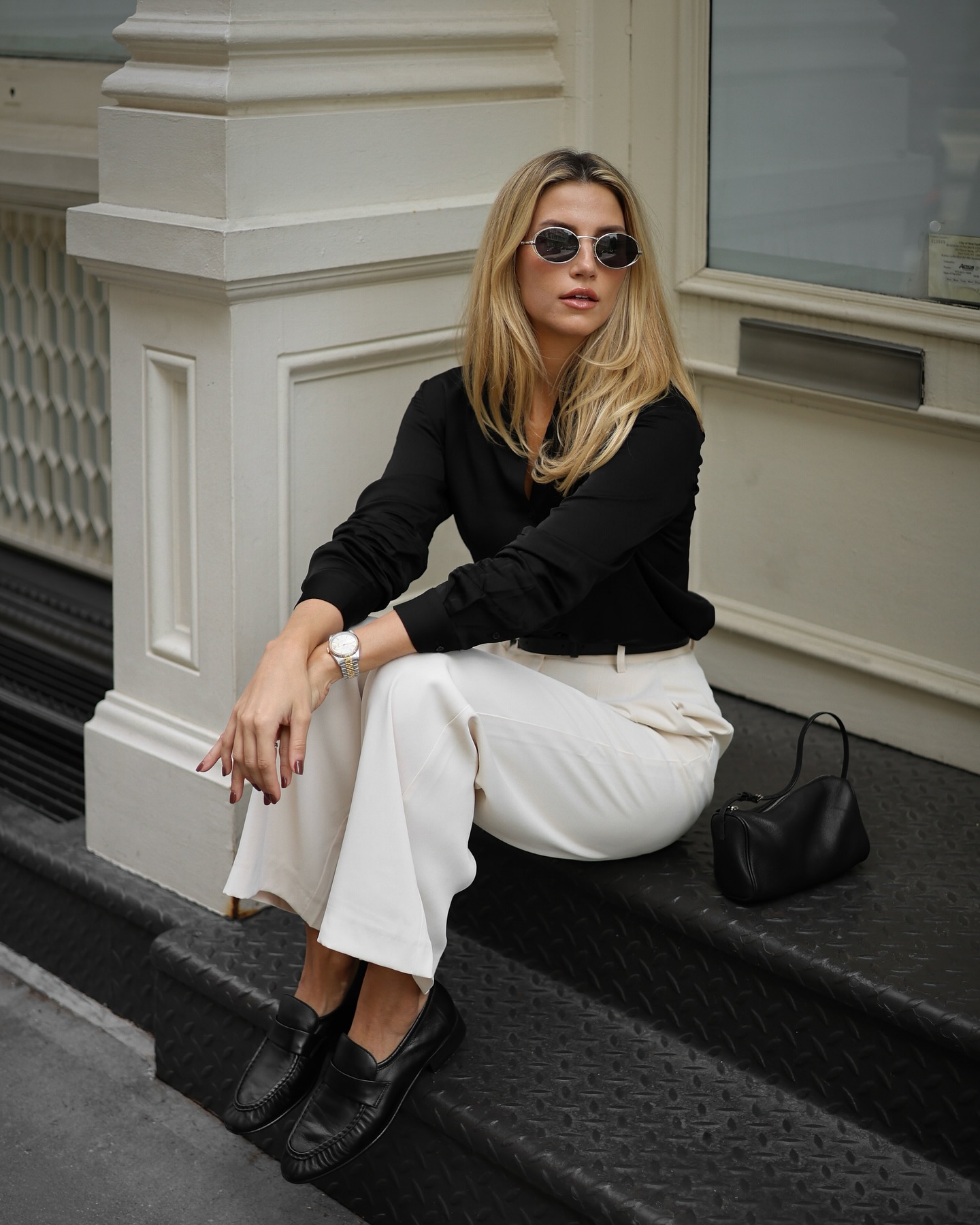 This outfit feels really easy, however the material of the shirt and the formality of the trousers make it a laid-back office-day look. I am an enormous fan of the oversize framed glasses Elsa Hosk styled this look with. I must get my arms on the precise pair she has.