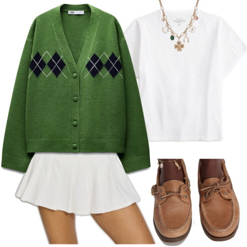 Merchandise: Cardigan, T-Shirt, Skort, Necklace, Boat Footwear