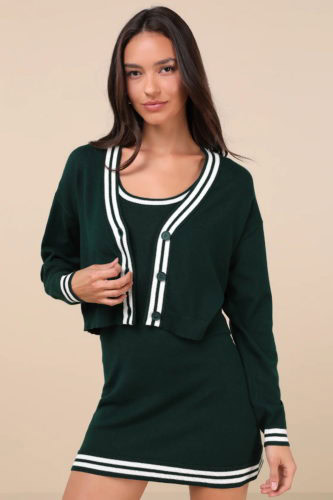 How lovely is that this inexperienced knit sweater gown and matching cardigan, each with a sporty white trim?