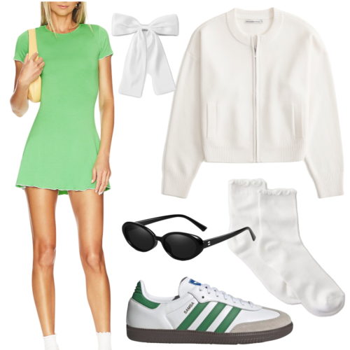 Begin off with this inexperienced t-shirt mini gown that has lettuce trim and a crew neckline. Hold it informal by styling it with some white low-top sneakers, like this matching pair of Adidas Sambas which have inexperienced stripes. White crew socks will add to the sporty vibe, and this ribbed pair with lettuce-edge trims mirrors the trim of the gown.