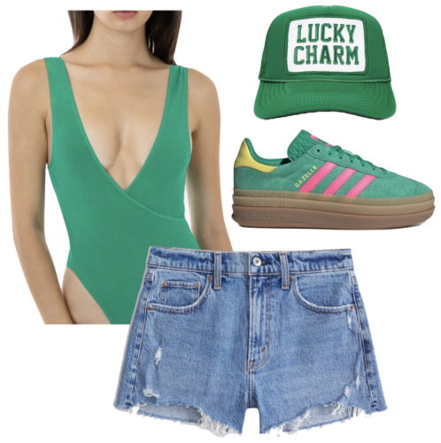 Don’t overlook enjoyable equipment like a “Fortunate Attraction” inexperienced trucker hat, which is the final word strategy to pull this social gathering look collectively.