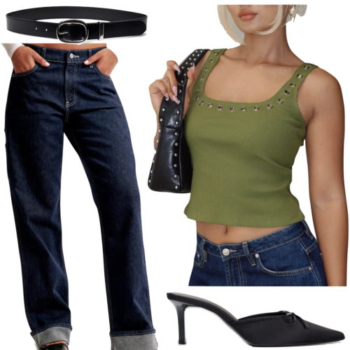 This olive-green cropped tank high has metallic eyelet particulars, giving it a cool, sudden edge that may pair nicely with some darkish denim. Cuffed denims are an enormous development this season, so embrace the look with these cuffed dishevelled denims, together with a large black leather-based belt that has an oval buckle (silver to match the eyelets, after all).
