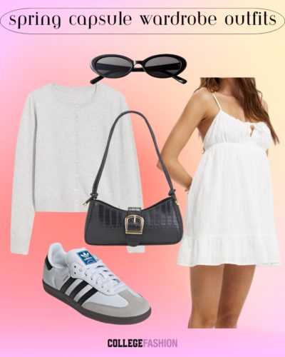 Add a stylish contact to the breezy white mini gown by styling it with some Adidas Samba sneakers and a cute cardigan sweater (since you’ll want layers within the springtime).