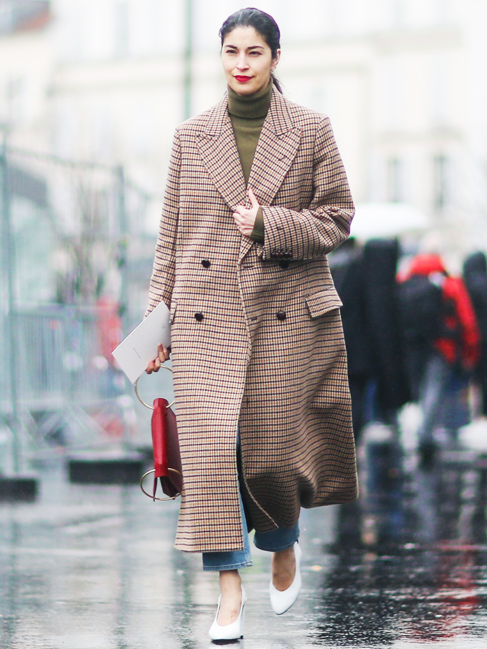Model Notes: For a glossy work-to-weekend ensemble, attain for a checked coat, straight denims (in case your workplace permits denim—in any other case change in cigarette trousers) and white low heels. Simply add socks if you happen to’re feeling the coolness.