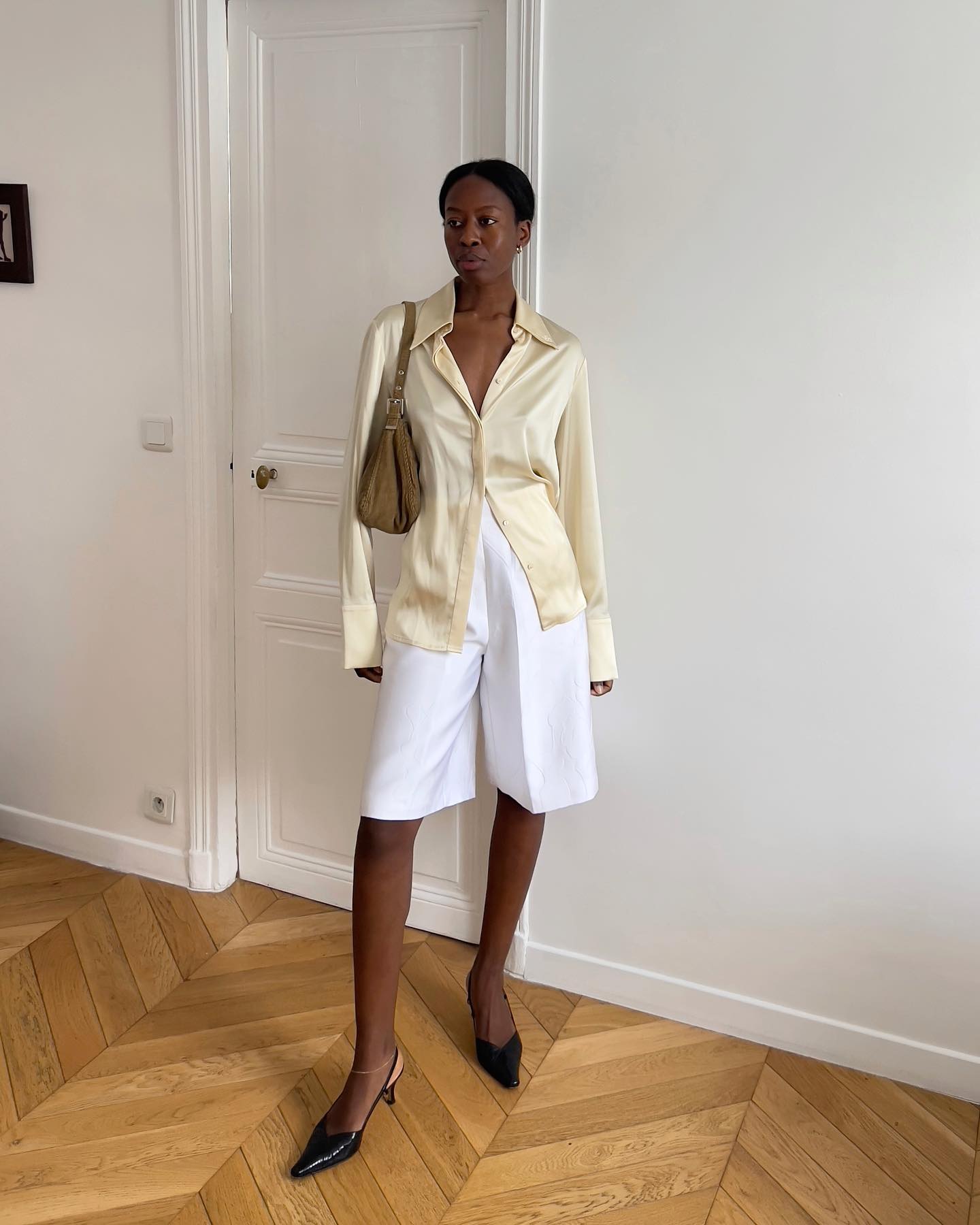 Now this outfit, I really like. The satin button down feels relaxed but nonetheless formal sufficient to put on to work and the bermuda shorts really feel so modern to me. The pumps add an additional oomf too.