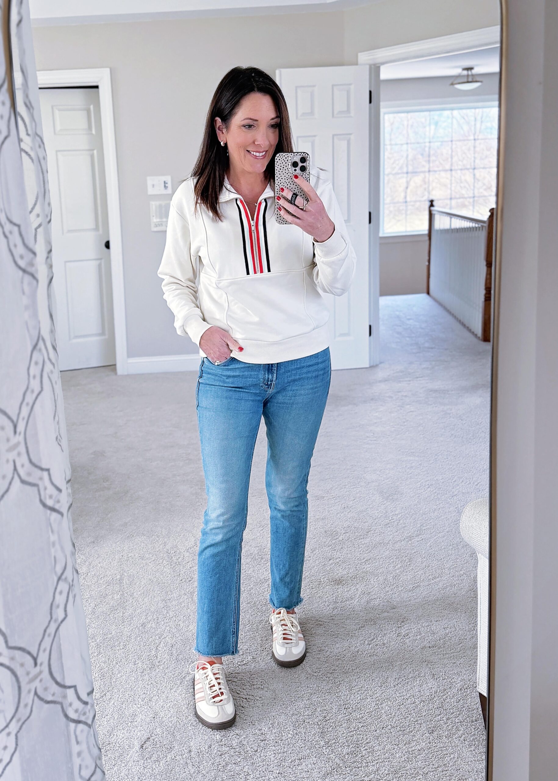 Even a impartial pullover can really feel recent with the appropriate particulars. I’m loving this half zip with the refined stripes—it’s enjoyable with out being over-the-top, and you’ll put on into spring with jean shorts when the climate warms up.