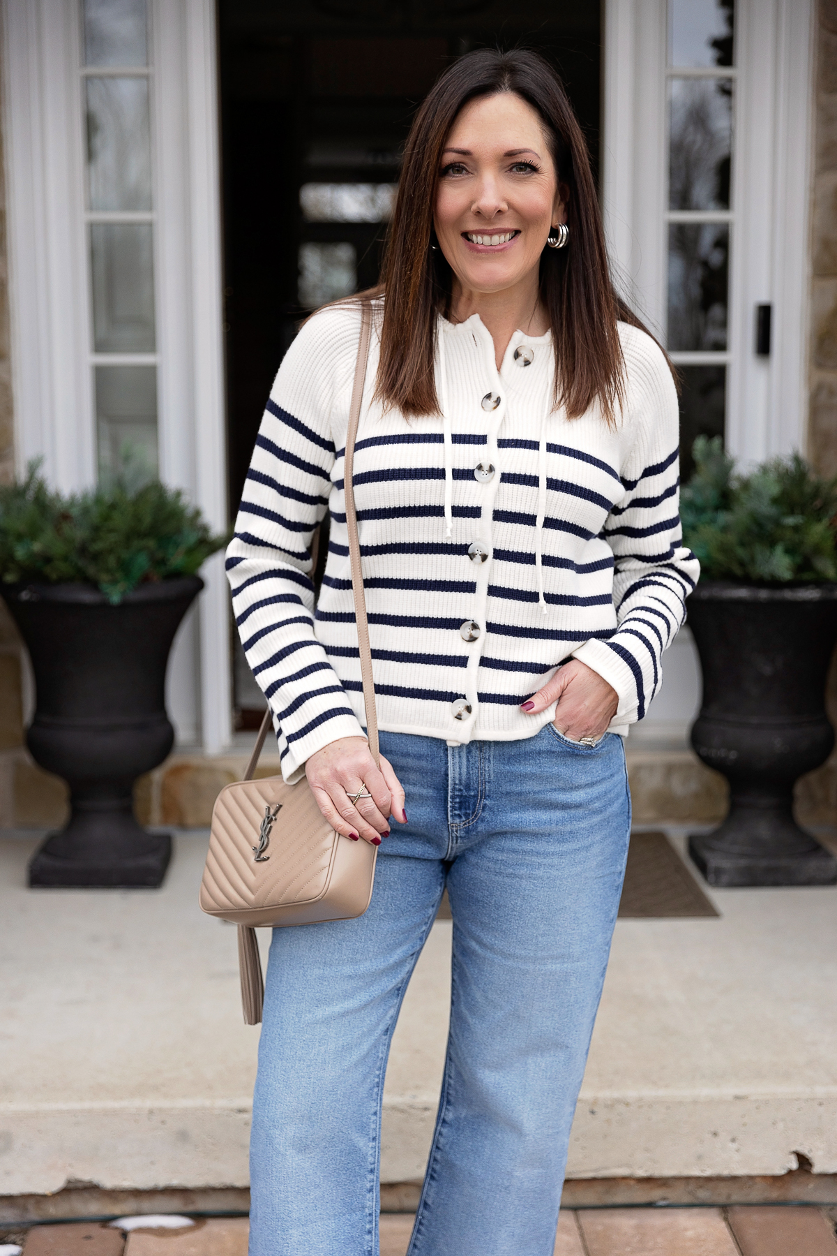 You realize me—I’m a sweater lady via and thru, so this time of 12 months, I like so as to add a number of enjoyable colours to brighten issues up. I just lately picked up this daring inexperienced and navy stripe pullover that I styled with flare denims and silver sneakers, and I additionally love this gray and pink model.