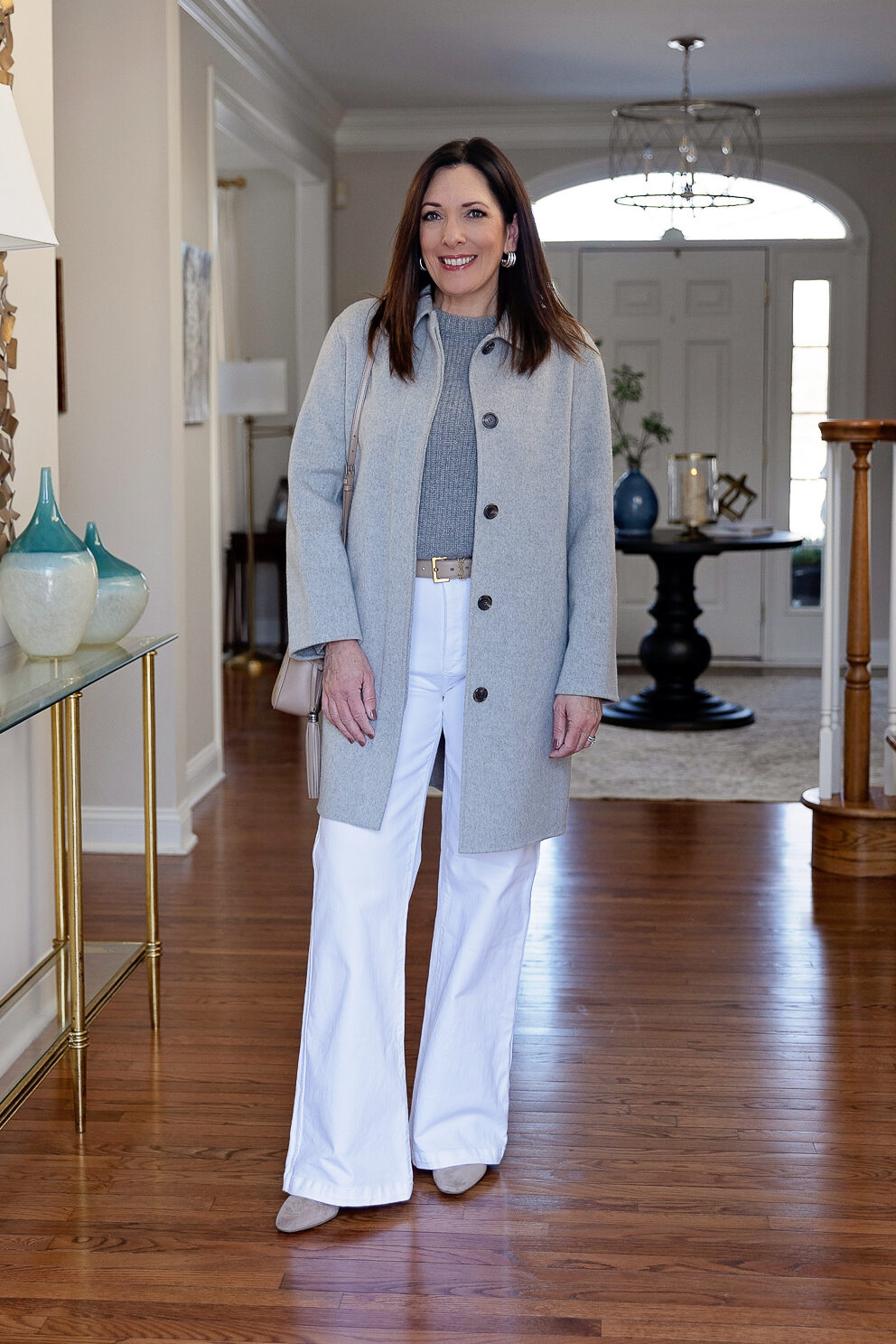 One other straightforward technique to loosen up a winter outfit with out sacrificing heat is to pair white denims with a comfortable gray cashmere sweater—bonus factors for topping it off with a coordinating gray wool coat. This combo is easy but polished, and the tonal layers preserve it feeling recent for the season.